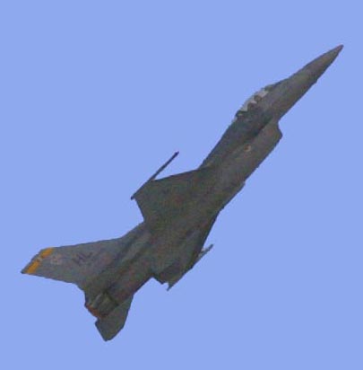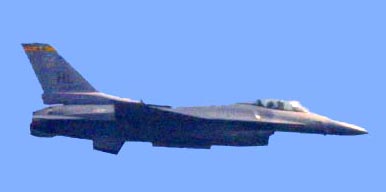 A side view of three of the best war planes of their day. Note how small the World War Two vintage P-51 Mustang appears along side of the F-16, and A-10. |