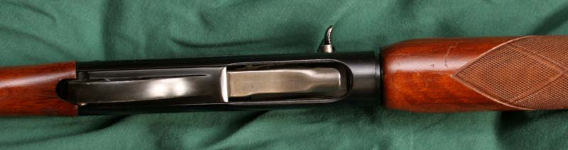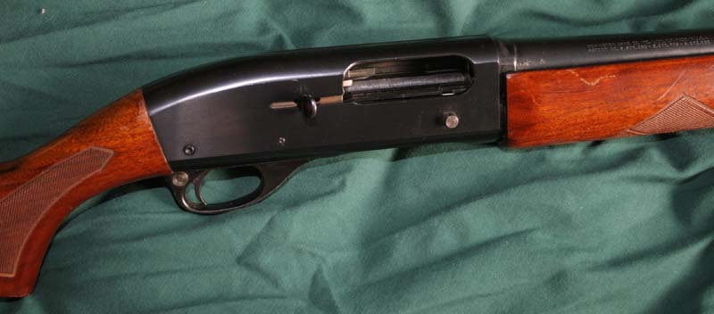 can be no loading gate as there is in the classic lever action rifle. One consequence of h The well regarded Remington 870 slide action shotgun is a direct descendant of this weapon. It shares the bolt, magazine, and in some models, the barrel, and reciever of the 1100. It also shares the dual action bars of the newer model 1100. Where the 870 and 1100 differ is in the way the bolt is unlocked, and forced to the rear. In the 870, the dual action bars are forced back by the cycling of the slide. In the 1100-48 model, the bolt is driven back by the motion of the barrel, as the two recoil back together. In the newer models, a gas system is used. In the gas system, a piston works the action bar, which in turn works the bolt. The piston is driven back by a small amount of gas bled off from a port in the barrel. The gas system permits the use of a stationary barrel, and makes factory adjustment of the gun less critical. My example is clean, and seems to have lead an easy life, considering it's age (I wish I could say the same for myself). I have a magazine extension which gives it a capacity of 8 rounds (plus 1 in the chamber). I have also added a carry strap with ten cartridge loops. This is a pleasant gun to shoot, and can be fired very rapidly. The newer models have a stationary barrel which does not travel with the bolt during recoil. In an interesting case of payback, this new stationary barrel was initially an improvement to the 870 model, but was soon incorporated into the parent model, requiring it's conversion to the gas system. It seems that this is one of those rare occasions in which a parent picks up a bit of improvement by way of the offspring. |