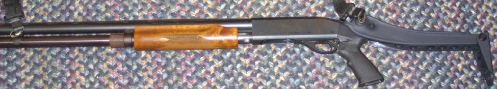 For decades, this has been the shotgun filling gun cabinets, rifle racks, and the mounts of police cruisers and pick up trucks. The 870 has been offered in a variety of finishes, and barrel lengths, over the years, as well as special trap versions, and the Deerslayer, with open sights and a slug friendly, cylinder barrel. The express version sells for around $200, as of this writing, and is the economy model. The gun has been produced in a variety of finishes, and is even offered in a stainless steel model. Because of it's popularity, aftermarket companies offer nearly every conceivable accessory. Chambering are offered in everything from the 410, to the 10 gauge. The first shotgun that I ever owned, and one of my first firearms purchases, back when I was 18, was a standard grade Wingmaster. In addition to the magazine extension, this gun has an ATI folding stock, with a pistol grip. With the stock extended, the 870 is 46" long, down a few inches