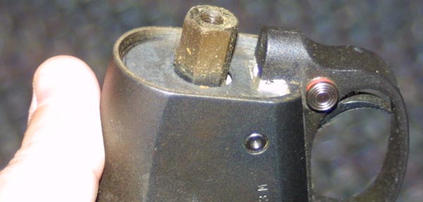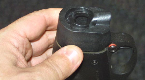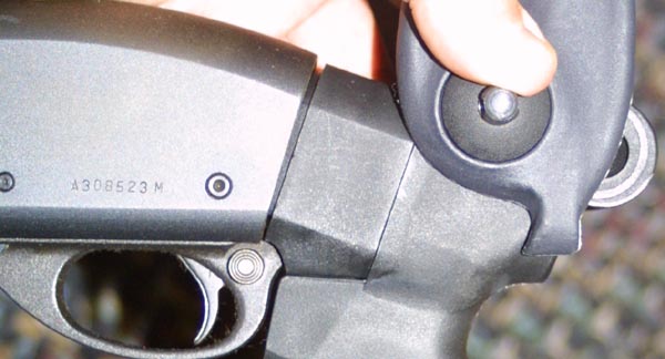 small button, on the left hand side, just behind the sling stud. For