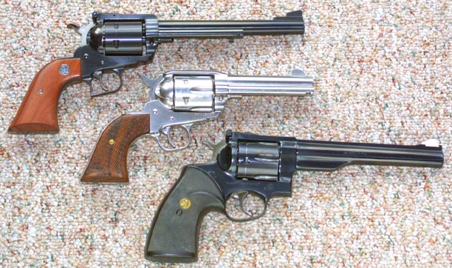 tag on the new Smith and Wesson X frame guns. Ruger has become, as of the last couple of years. The nation' s largest gunmaker. It had long ago passed up Colt, and has more recently passed up Smith and Wesson. The reason for this was pretty obvious. The Ruger company was run by one man. Bill Ruger loved firearms. He collected, and shot, and was an enthusiastic firearms hobbyist. He designed and produced guns, not according to business models, or marketing forecasts; but according to what he himself wanted as a gun enthusiast. Bill Ruger was rarely wrong in his judgments. Bill Ruger died on July 6, 2002, at the age of 86. Who says the good die young? His son left the company in 2006. A trio of Ruger six guns is shown in the photo to the right.