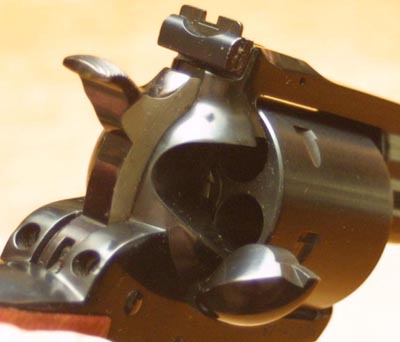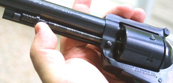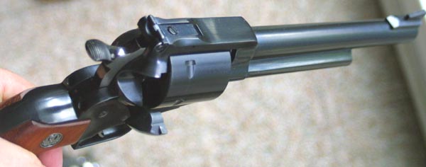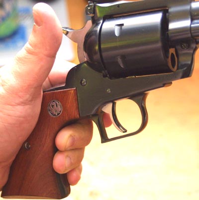 Model 29, in those days, for less than $500 - $600. A Ruger Blackhawk was the first 44 Magnum handgun that I had ever fired. This was back in the late seventies, when magnum fever, and the influence of Dirty Harry were both at their peak. No one that I knew had a Model 29; but a member of my circle of friends did own a Blackhawk. We all went out to the home of a friend of mine, who lived out in the country, where it was legal to discharge firearms. We had planned to make a day of it. I brought a Colt 1911, along with my old Dan Wesson 357, my old S&W Model 59, and a Remington 870 shotgun. Of course, the highlight of the day was getting to shoot the 44 Magnum. We all took turns with the gun. Expecting to be hammered by the recoil of the big 44, I was pleasantly surprised. The gun kicked, of course; but was quite manageable. It was also surprisingly accurate. I hit everything that I aimed at. There were four of us there, shooting up the woods, shooting at cans, and having what we told ourselves was a manly good time. During a period when the traditional sex roles were in transition, and the gay rights movement was in full swing, young men often looked for reassurance. Magnum handguns helped. In 1956, having caught wind of the new big bore hunting cartridge being developed jointly by Remington, and S&W, Bill Ruger somehow got ahold of some examples of the new cartridge, and modified his Blackhawk design to chamber and fire the new round. The 44 Magnum version of the Blackhawk had an alloy grip frame, and was produced until 1963. These guns seemed a bit small for this powerful new cartridge, and the grips were a bit too small to comfortably soak up the massive recoil. Still, the guns had a certain following. In response to some of the shortcomings of the 44 Blackhawks, Bill Ruger introduced a new 44 Magnum model, called the Super Blackhawk in 1959. He changed the shape of the grip frame, adopting the same style as that on the old Colt Dragoon black powder revolver. This gave a wider and more flowing grip, to help soak up recoil. At the same time he made the grip frame and ejector rod housing out of steel, rather than aluminum. He then left the flutes out of the .44 Magnum cylinder, giving the gun a distinctive new look. These changes also brought the weight of the gun up, another factor to help in controlling recoil. The Super Blackhawk was offered with a 7 1/2" barrel. In 1973 Ruger changed its single action revolvers over to the New Model action style, employing a transfer bar ignition system which allowed the shooter to The Ruger is a modern single action, in the sense that it does not presume to be an accurate copy of a more than 100 year old design. The Blackhawk has adjustable sights, coil springs, modern metal alloys, enhanced safety, and is designed for modern production methods. Bill Ruger once said that the Black hawk was his interpretation of the way that a single action revolver would have been designed, had the model first come into use today. With it's squared off top strap, ramp front sight, adjustable rear sight, and unfluted cylinder, the Blackhawk does not really look like a cowboy gun, except in the broadest sense. For those who are involved in cowboy shooting, or would just like something which has a more authentic look, Ruger began to produce the Bisley and Vaquero models. The Super Blackhawk is a considerably larger gun than the Colt Single Action Army, and requires a larger holster. So much for the history; how does the gun shoot? In common with other traditional design single action revolvers, the grip frame of the Super Blackhawk rolls the gun back in the shooter's hand and absorbs a good deal of the felt recoil. This also tends to put the hammer right under the shooter's thumb, for recocking. This particular example is one of the New Model guns. The single action pull is nothing short of marvelous. It is light with a clean break. The adjustable sights are easy to see and use, though there tends to be a bit of horizontal play. The play in the rear sight is a common failing of this model, and is easy to fix with a vice and a punch. The first time I went out into the field with it, I shot one inch groups with this gun, the best groups I have ever shot in any gun of this caliber, with the sometime exception of my Dan Wesson. These days, the recoil of the 44 Magnum has been far surpassed by several more modern rounds. Even so, it is still pretty impressive. The shape of the Super Blackhawk grips helps to moderate this a bit, and makes the gun a bit easier to shoot than some double action models. Of course, being a single action design, the Blackhawk is not exactly a rapid fire handgun; but then, the 44 Magnum does not exactly lend itself to rapid fire, no matter what the action type. S&W did eventually redesign the Model 29, somewhat, in the eighties, adding what they called the Endurance Package. This was due, in part, to the greater strength of the Blackhawk, which tended to cast a bit of a shadow over the older Model 29. I recall some old load books of mine, from the early eighties, which gave, in addition to standard loads, special loads which were only for use in the Blackhawk, and another series of special loads which were only for use in the Thompson Contender. Frankly, the standard loads are plenty, for all but the most hardy, and pain seeking gun enthusiasts. For such people, I recommend the Casull 454, or perhaps the new S&W 500 magnum, rather than attempting to push the 44 Magnum even farther than it has already been pushed. Ruger now offers a pretty wide selection of single action, and double action revolvers. The double action Redhawk is now offered in several different calibers, and barrel lengths. It is
