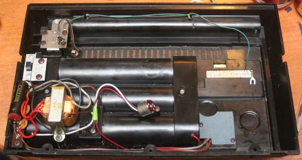 Within the back, the transformer and power supply components may be removed by loosening three screws that hold them in place. There is also a transformer held in place by a pair of screws, and an AC/DC switch under a dust cover. With all of these removed, the back panels of the radio may be cleaned with (*GASP*) soap and water. A photo of the inside of the back is to the left. Note the RCA jack and cord to the upper left, and the three socket power plug just below the center of the photo. Now for the hard