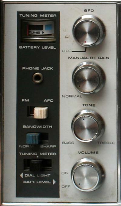 The Transoceanic has what can only be called a control panel. It is to left of the speaker on the front surface of the radio. All of the major controls are here, except the bandswitch, and tuning dial. A combination tuning meter and battery meter sits at the top of the panel. Just below this is a standard 1/8" audio jack. Another line out, marked tuner, is located on the back of the radio. Dials BFO: For those not familiar with it, a BFO (Beat Frequency Oscillator) permits legible reception of of SSB signals, and renders Morse Code as the classic beeps. It is adjustable to fine tune for variations in the sidebands. On CB radios, this dial is called a clarifier. RF Gain: When set to Normal, an auto gain circuit is used. When switched to manual, this control will attenuate incoming signals. This is handy when powerful signals on nearby frequencies are causing interference, or when the receiver's front end is in danger of being overloaded. So this control allows for a relatively sensitive receiver that can be toned down in high signal areas. Tone: Pretty obvious what this one does. Basically it alternates between a high frequency and low frequency filter. This can be handy with signals that are too sharp or too muddy. Volume: Another pretty obvious control. Louder or softer. This controls the radio's half watt audio amp. It also acts as the on/off switch. Switches AFC: This cuts in the AFC on FM. AFC locks to a signal even if the frequency should drift Bandwidth: This switches from a wide to narrow signal bandwidth. This can be handy when zeroing in on a weak signal, or broadening out to try and smooth a strong signal. Meter/Light: In normal position, this leaves the tuning meter active. When switched to one side, it turns on the dial light. When switched to the other side it shows battery level.