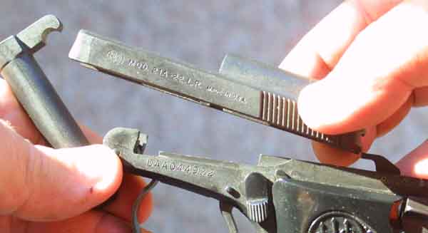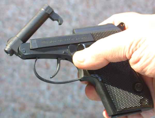 The M-21 also has some unique features of it's own, like the flip up barrel for loading single rounds, or checking the chamber. This particular model is chambered for the 22 long rifle, rather than the loathsome 25 acp that seems to be the curse of most small pistols. There are 25 acp, and even 22 short versions being produced (Jetfire, and Minx models), but the 22 long rifle is the best caliber of the three. An amazing amount of thought and care went into the design and production of this little gun when compared to others of it's ilk. This is the highest quality pocket gun I have ever seen, although the Walther TPH is reputed to be of similar quality. The gun is frighteningly easy to clean. You simply tip up the barrel and pull the slide off of the frame. There is not even a recoil spring to worry about as the slide is driven forward by a captive spring inside of the frame. The only criticism of the gun is more a matter of this whole class of guns rather than one of this particular model. Guns of this size are very difficult to shoot with any degree of accuracy. The sights and the guns themselves are just too small for precise shooting. On the other hand, a friend of mine is considering getting this gun for his mother whose fingers are badly twisted by arthritis. She has not got the strength to pull a slide back, but can easily pop up the barrel and load a cartridge, then pull the trigger in double action mode, making this gun a semi-auto alternative to a small revolver. The
