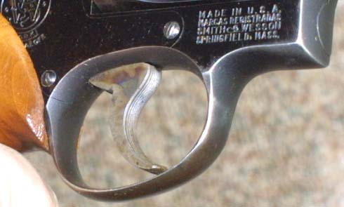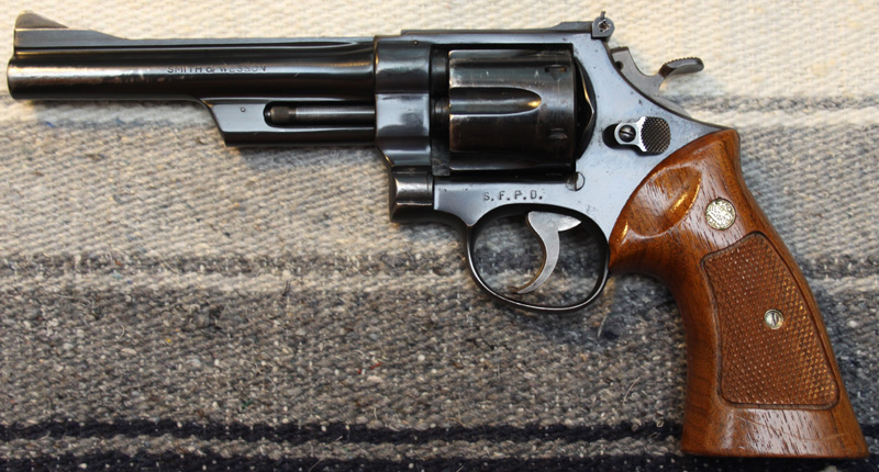 adding velocity through a longer barrel. This cartridge was initially designed for 8 3/8" barrels, and a six inch should be considered a minimum, for the use of the magnum loads. The longer barrel also adds a bit to the length of the sight radius, allowing me to tighten up my groups, just a bit. The extra length, and weight, along with the slight forward shift in the center of balance, add marginally to the stability of the gun. The six inch gun is a former SanFracisco police gun, retired in the eighties. It has a badly worn finish, some surface rust, and a number of scuffs and scratches. Police guns often lead hard lives. I like the idea of having a former SF police gun, and though the gun was likely never removed from its holster, the history gives it character. The gun is marked under the cylinder with S.F.P.D. to identify it. I will need to exercise care to retain the markings when I refinish this gun. The six inch version has the standard target grips, the usual adjustable sights, grooved combat trigger, and target hammer. Generally, uniformed police officers carried four inch guns, which makes me wonder if this was a detective gun or a tactical officer gun. A shoulder holster is a bit better way to carry a longer gun, than the standard belt holster of the uniformed officer. I plan to refinish both guns, either in blue or electroless nickel, and will document the process on a different page, when time permits. Whichever finish I use, each gun must be completely disassembled, cleaned thoroughly, and have all finish removed. I am leaning towards electroless, because of it's better protection, and the nearly identical amount of effort, and money when compared to a home bluing job of good quality. The electroless process is also considerably faster (about an hour) than a genuine blue, of good quality (as long as several days). |