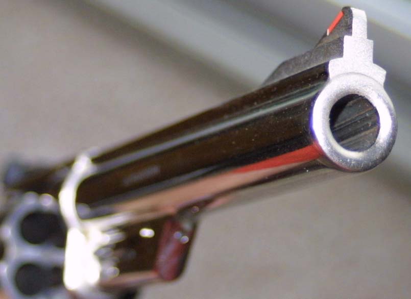 set the Dirty Harry commentary separate from that of the M-29 itself.There is some disagreement on whether a genuine .44 was actually used in these movies or not. It is rumored that the actual gun used during filming, was a model 57 (41 Magnum), because of the lack of production M-29's at the time the movie was being made. This could have been pulled off quite easily, for two reasons. The bore sizes of the two calibers are very close. The .44 Magnum is based on the .44 Special, which itself is based on the much older .44 Russian. This cartridge (the .44 Russian) was developed in the 1870's to compete with the .45 Long Colt. The actual bore size of all of these .44's is .429, rather than .44. The .41 Magnum is a much more recent cartridge, and has a bore size of .41, more closely reflecting it's name. The difference between the two bore sizes, is therefore only .019". This is approximately 1/50th of an inch. It is doubtful that most people could tell the difference, particularly on casual examination. There is also the fact that the three top of the line S&W magnum revolvers, are all built on the same frame, and all use the same cylinder, and barrel blanks. Other than the different borings of the barrels and cylinders, the guns are identical. It has also been said that a Model 25, in 45 A.C.P. was used, due to the more easy availability of 45 blanks. About the only thing that seems to be agreed upon, is that the gun used for filming was not a Model 29. So why might a different caliber been used, rather than the .44? The truth is that, previous to all of the hype generated by the Dirty Harry movies, the M-29, was just plain not popular. The gun was (and continues to be) big, heavy, unpleasant to shoot, and overpowered for defense. It's only real use would be for hunting larger animals, and hunting with a handgun was almost unheard of back in the fifties, and sixties. Many hunters had considered it to be inhumane. The Model 29 was always a gun of very limited numbers, bought by a small and specialized segment of the shooting public. Because of the relatively slow demand, production would sometimes stop, though the gun was never removed from the S&W catalog. At the time that Dirty Harry was being produced, the Model 29 was not even being made. Clint Eastwood has never commented on these rumors, and may not have known himself, what he was firing, so closely do these guns resemble each other. Movie guns are generally specially modified so that real ammunition can not chamber or fire in them, making the distinction between these, very similar guns, even more difficult to determine. Typically, movie guns fire 6 in 1 blanks, which make filming action seens quite a bit easier, as frequent reloading between takes is not required. Studio armourers handle all firearms, and all blank ammunition. What is known, is that Eastwood procured an actual .44 so that he could get a feel for what shooting the gun was like, to help him better play his part, but did not use this gun during filming. The gun he used, is said to have been made up specially from extra parts, and repair spares that were stocked by the factory. I have seen many "proofs" on both sides of this issue, and hope to take a trip down to the S&W museum, to verify. Emails to S&W have not yet recieved a satisfactory response.