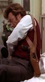 their hips like cowboys. The NThe holster itself is deserving of some comment, as it was quite an advanced design, in it's day, and incorporated a number of new features, which still hold it in good stead today. The most significant was the use of a bit of spring steel to permit the gun to be securely held, while offering a very fast draw. This was done in combination with a, then new, open fronted holster design, producing what has come to be called the clamshell holster. Holsters have traditionally been designed to have the pistol pulled straight out of the top. This is a natural enough design; but offers certain disadvantages for the shoulder holster. The main disadvantage of a traditional top draw, in a shoulder holster, is that it tends to make the draw exaggerated, and very circular. This costs a great deal of speed, and can also make the gun liable to snag. The clamshell design allows the gun to pivot, and be drawn straight out. So great can this advantage be, that it also began to be incorporated into certain belt holsters. The clamshell design was incorporated into a number of latter shoulder holsters, most notably the popular Bianchi XP-1000 series; but never with the elegance of this groundbreaking model. Note that this holster features a cut out for the revolver cylinder, allowing it to be a bit thinner, and also giving the holster a better and more secure grip on the gun. Some latter models incorporated a pouch for speedloaders, in the side opposite the gun. In the Movies, Dirty Harry simply carried three speed loaders in his jacket pocket giving him a total of 24 rounds, inclusive of the cartridges loaded in the Revolver's cylinder. Due to the perversity of the collector mentality, these holsters are often more expensive than the guns which they carry. A genuine Dirty Harry holster can cost $500-$1000, if it is in pristine condition. The reason for this is pretty simple --- rarity. A Model 29 handgun is made to withstand the force of explosions taking place within it's cylinder. It is made from various sorts of alloyed steel, and is proof tested before leaving the factory. A holster is not. A holster is made from leather, or synthetic, and only needs to be strong enough to hold the weight of a gun, with a reasonable margin built in. Holsters rot, tear, and are sometimes lost. A gun owner will lovingly clean, oil, and carefully store his handguns, after use. A holster, on the other hand, will generally be removed, and tossed in a closet, or drawer. There is also some argument over what barrel length was used. This is a bit easier to answer. The 6 1/2" barrel was used in the first two movies, while the 8 38" barreled gun was used in the next. Just to complicate matters, the posters, and publicity art sometimes depicted longer barrels than those used on the movie guns. What needs to be kept in mind, when discussing such matters, is that these are movies. Things are done for effect here, and reality often takes a back seat.