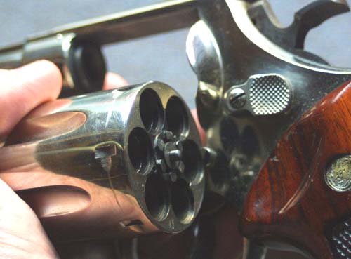 section on the 44 Magnum.The fit and finish of this gun are superb, as the photo shows. This is a heavy piece, and was considered to be ungainly, and burdensome to carry, back in the fifties, and sixties. Guns have grown larger, in the last few decades, in part because of the increase in handgun hunting. There are now several pistols which make the old N frame Smiths seem almost petite. The double action pull is smooth, crisp, and light, at least on my gun. The single action pull, is startlingly light, and crisp, and breaks without any warning; perfect. The gun was bought used, and I suspect that a previous owner may have had the action smoothed, or it may just be that the gun was well cared for, and properly broken in. In general, these guns are very stable platforms, for deliberate aimed fire. Single action shooting, with .44 special loads, can produce groups of 2". Double action work, particularly with magnum loads, can more than double this group size, at least for me. I suspect that there are few shooters out there who use rapid fire, double action with this gun. Shooting the 44 magnum cartridge out of this gun, single action, with a proper rest, can give me sub 2" groups; but I suspect that the gun is capable of even better accuracy than this, when in highly skilled hands. The model 29 became hugely popular, after the Dirty Harry movies, and Smith never did bring production up to a level to meet demand. At their peak of popularity, these guns were selling for almost triple what the suggested price was. I recall in the late seventies, When I bought my first model 29, they retailed for around $200; but you could not touch one for less than $600. The feeding frenzy ended with the introduction of double action .44 revolvers by several competitors, and the realization of many shooters, that the .44 was a bit more gun than they really wanted. With the introduction of the Ruger Blackhawk, as well as a number of other single action revolvers chambered for the 44, a large number of handgunners were able to sate their desire for a 44, without paying the ruinous prices being asked for the Model 29 during their Dirty Harry years. With the introduction of the Ruger Redhawk, as well as the introduction of the Dan Wesson 44, S&W had some real competition. Not only did their added numbers affect the market; but there was also the fact that these guns were stronger, and less expensive than the big S&W. In order to maintain their hold on the market, S&W intitally resorted to some cost cutting measures, so that they could lower the cost of the guns. They then took some steps to increase the strength of the Model 29. The Model 29 has an actual bore diameter of .429, giving just a bit more metal between the cylinders, than would be the case with a 45. This margin of strength As was true, during the filming of Dirty Harry, the M-29 is once again out of production, though the stainless steel version (M-629) is still being made. A 50th anniversary model was produced, in 2004; but I fear that this may be the future of the big N frame magnums --- limited editions, and commemoratives. There are currently no N frame revolvers being made in regular steel, and as far as I know, only the 629 (44), 657 (41), and 625 (45) are being made in stainless. The classic, big frame Smiths are becoming a thing of the past, with only the 629 being produced in any kind of quantity. They will be mourned. Dirty Harry