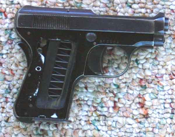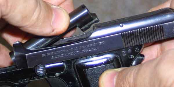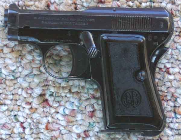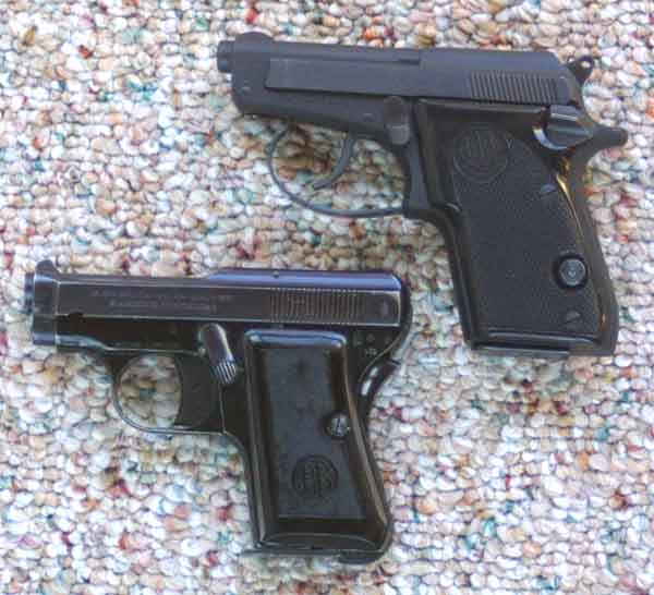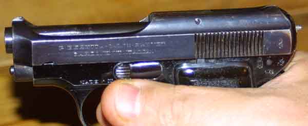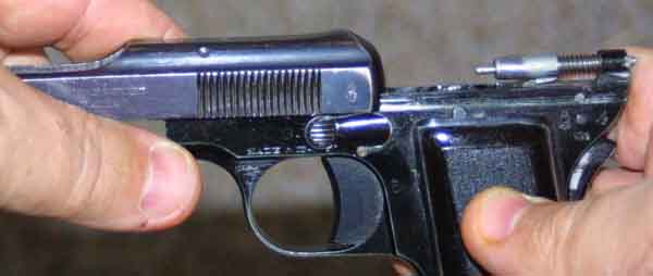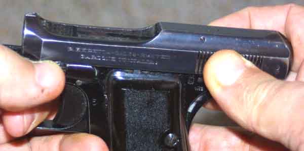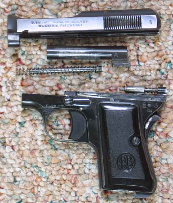 It has the distinctive open top shared by all Beretta pistols, and in it can be seen the embryonic lines of the later Jetfire, Minx, and Model 21 pocket pistols, as well as a bit of the influence of the well known 1934 series of pistols in .380. These guns were all produced before the Helwan, Brigadier, and other full sized pistols, which were to evolve into the Model 92 series. At the time, Beretta was known for small, pocket pistols. The company was not, then, particularly well respected by American handgun enthusiasts. Italian manufacturers, in general, were perceived as producers of stilettos, and switchblades, as well as nasty little cheap pistols, for hoodlums, and for housewives who didn't know any better. Guns like the M-52, as well made as it may have been, did not help. It is chambered for that most horrible of all calibers, the .25 A.C.P. I consider the .22 to be a much better and more versatile caliber, it is also less expensive and does not have the unfortunate association with cheap "Saturday Night Specials" that the .25 A.C.P. does. In addition, the far less expensive 22 L.R. has about double the energy of the 25 auto. The photo above shows the little M-52 with it's grip removed, showing the skeletal magazine in place. The photo to the left, shows the little M-52, alongside a current production Beretta M-21, in 22 L.R. There is a pretty strong family resemblance here, though something like forty years separates the design and production of these guns. In both cases, these guns are far better made, and far more fully featured, than the average vest pocket type of pistol. Beretta is the oldest firearms company in the world, having started out by making cannon barrels in the fifteenth century. It is primarily known for it's great sporting shotguns; but has had considerable experience in producing military firearms, which far predates it's current production of the U.S. Army's M-9 series of handguns. The little pocket pistols that Beretta produced in the forties, fifties, and into the sixties, were a way for the company to keep itself alive, after the Italian side lost World War Two. Descendants of these pistols are still produced today, in a number of variants, even as Beretta has become known as a maker of full sized pistols. This little gun was the first Beretta I ever owned, and was bought at a gun show, back in the seventies. It is so small and thin, that I can carry it in a shirt pocket. It is now one of four Beretta pistols that I own, the others being a model 96, a model 21, and a BDA (marketed by Browning; but made by Beretta). Disassembly