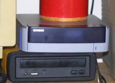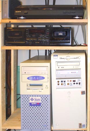 is probably a bit of overkill. The photo to the right shows my rinky dink little set up for converting vinyl albums, or casettes, into digital. For other sources, such as (cringe) 8-track, I would do something similar. My turntable is at the top of the photo, next to an external 120gb drive. The turntable is connected through the front panel jacks, while the casette deck below is connected via a rear panel jack. My Sun SPARC machine (Unix) shares a shelf with Mogul. Actually, there is an even more rinky dink way of doing this which involves a splitter/converter for the use of standard RCA jacks in a 1/8" input in the back of a sound card. For those using a turntable, you may wish to be aware of the signal levels on most turntables, and input lines. For this to make any sense, to anyone younger than about forty or so, a little history is in order. Once upon a time, there were two types of phonograph cartridges in widespread use, the ceramic, and the magnetic. The ceramic cartridge was the original high fidelity type, invented in the thirties by RCA, and the forties by Columbia. These initially used crystals, but soon utilized a piezo system which gave a longer playing time, and tracked at 6 grams, as opposed to the 10 grams of the crystal versions. These cartridges were introduced along with a new style of record, made from vinyl, instead of the old shellac discs. The old shellac discs, used since the turn of the century, broke easily, had a very poor signal to noise ration, with lots of hiss, and had a frequency range of 50 to 8khz (some of the very earliest, before the advent of electronic recording methods in the mid 1920's, had a range of 50 to 4khz). The new vinyl records did not have the hiss, and could reproduce sounds up to 12khz. They also offered, at 45 or 33.3 rpm, longer playing time than the old 78 rpm shellac records. The new vinyl albums were great, but by the sixties, electronic recording gear had improved to the extent, that it was possible to extend the range of recorded material. This in turn made greater demands upon the cartridges, and the records. In answer to this, the new magnetic cartridge was developed. This cartridge was capable of lighter tracking, generally two to four grams, and faster response than the old ceramic styles. There were two issues with the new cartridges, however. The first was that they had a considerably lower output than the old ceramic types. Outputs varied somewhat from cartridge to cartridge, but the typical ceramic cartridge produced 0.5 to 0.7 volts, though some of the earlier versions made as much as 3 volts. A typical magnetic cartridge would put out 5mv (0.05v), though some could produce as much as 50mv. The Magnetic cartridge also required around 50k ohms impedance, as compared to the 1m to 2m required by the ceramic cartridge. The second problem with the magnetic cartridge was that they did not play flat. They required special equalization in order to faithfully reproduce the recording. Both of these issues were dealt with by the use of a phono preamp, or by a special phono connection on the amplifier. Original line inputs were developed for the voltage produced by the ceramic cartridge. When home tape recording and audio gear began to appear, it was designed to operate at this same level, in order to conform to existing equipment. Where a tape source can be connected directly to the line in on your sound card, the phonograph will have to be connected through a preamp, or through a system amplifier. There are some exceptions however. The Sony turntable which I use, has a switch for use with a standard line in. This activates a built in preamp/equalizer within the turntable itself. This is a nice touch, and something that would have been very welcome back in the sixties and seventies when the turntable reached it's peak of popularity. The other exception would be if you could find an old style turntable with a ceramic cartridge, though I strongly recommend against this approach. The old ceramic cartridges were heavy, wore out records, and did not sound as good as the magnetic cartridges. CD is a little different. Audio CD can be recorded pretty easily, through my computers built in CD drive. Unlike most computers, this one has the CD connected to the sound card via digital cable, rather than the standard audio cable. What this means is that I can do direct digital to digital dubs and copies. In most computers, CD audio is sent down the cable in analog form, and is converted back into digital when it is dubbed. Live performances This can be a real challenge. It is one of the few instances where the break out box, and other features of this card are really needed. There are essentially two types of recordings that this set up will permit. The first is if the wave form, which essentially turns the computer into a digital tape recorder, and the second is through Midi. Midi is more like a control system than a music recorder. It does not record waveforms or sound at all. Instead, it records commands. Music is not really played in Midi; it is constructed. This offers some real advantages to the composer, or to the electronic music buff. Midi can score music played into a computer, it can also modify and change the sound, or apply other sounds, including those stored in a sound font. A sound font is a collection of sound either recorded, or created by the user. This is similar to the use of a wave table, for playing back Midi over the web. A wave table works by using a collection of stored waveforms, one for each instrument. As an example, the sound card may have a waveform stored for a piano. The midi file will have instructions saying retrieve the piano waveform, and to play certain notes at certain intervals using this waveform. This permits Midi files to be very small, compared to recorded music files, since the Midi file is little more than a glorified text file. Sound font sounds can be created by the user, either by recording sounds 