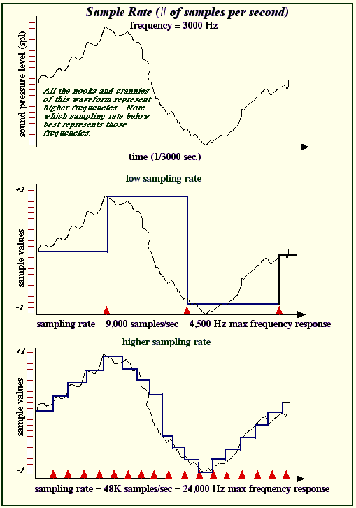 of data.Shown in the photo at left, is my little CD stack. The bottom unit is an external USB Cd burner. The unit above it, which looks like a second burner, is a USB label printer. This printer uses a thermal print process to print a label directly onto a standard CD print before recording. It will print text or graphics, imported from standard graphic files. Other options for labeling disks are the use of standard sized stick on labels, or of special blank disks which allow for direct printing on the disk surface. None of these options are particularly cheap, and some of the labels can actually cost more than the disks to which they are affixed. An intersting new development is that of the Lightscribe media, and the Lightscribe capable recorders. Lightscribe uses the same loaser which writes the files, to draw on the opposite surface of the disc. At present, this is stricly black and white, or more accurately, tan and gray; but who knows what the future might bring. As of this writing, Lightscribe capable recorders are compatative in price with standard recorders, though the media is anopther story. Lighscribe blank dvd's are presently (mid - 2006) selling for about a dollar each. Lightscribe CD's cost around fifty to seventy five cents. This makes them little diferent in cost from standard media, once the cost of the expensive labels, or direct labeling ribbons is taken into consideration. There is also the option of using recordable DVD media, though this is not yet as desirable a method as using CD's. The recordable DVD format is still undergoing development, and there are still issues being resolved regarding digital rights management. There is also the cost of the media and of the drives. Still, DVD is probably the wave of the future. The new audio DVD format uses 24 bit resolution, as compared to the 16 bit resolution of audio CD. The audio DVD format also has a copy prevention component, something which was never incorporated into the audio CD format. As with the recordable CD, the recordable DVD offers the option of storing audio cuts as files. At the risk of destroying a sacred icon, in truth digital music recordings are not intrinsically better than analog recordings. In many ways they are not as good. What digital recordings have going for them is the integrity of their material. A digital recording will sound as good after the 100th dub, copy or play, as it did when it was first made. Analog recordings degrade at every play, and degrade greatly, unless very great effort is made, at every copy. An analog recording is actually a direct image of a waveform, including amplitude, and frequency. When an analog track is recorded, a needle, or a magnetic coil is directly moved by the sound source, and leaves a track on a tape or on a metal cylinder. When an analog recording is played back, this process is reversed, and the groove moves the needle, or the track of charged particles moves the coil of a playback head. This directly and mechanically recreates the original wave. The problem with the analog method is that it records everything, including noise, and extraneous vibration. It also picks up any background noise every time it is copied, processed, or dubbed. In addition to this, any inconsistencies in speed, pitch, or reproduction in any piece of gear is picked up, and will be faithfully recorded in any future dubs down the line. As if all of this were not bad enough, every time you play a tape, or a record, it is worn and erased, just a tiny bit. When a digital recording is made, the original sound waveform is measured, and plotted. It is then converted into a stream of numbers. Every number represents a height in amplitude. In a 16 bit recording, which is what an audio CD uses, there are sixteen different levels of amplitude possible. The human ear can determine a change of 3db, so if each of the 16 different amplitude levels were to be rendered as a 3db difference, we would have a dynamic range of 48db. If this were done directly, then this would be the dynamic range of audio CD's. However, the converters used are designed to be able to average out between steps. What this means is that the converter will produce an extra level of range between each level, essentially doubling the dynamic range to 96db. If you look at the specs for an average CD player, you will see that this is just about the rating listed. So much for dynamic range, but if this is the only value represented by number, then what about frequency? Frequency is determined by how the various amplitude measurements are stitched together. The diagram below shows this pretty clearly, and also shows the great weakness of digital recording. Much of the data is thrown away to be filled in either by the converters in the player, or by the human brain's wonderful capacity to detect patterns, and to complete them when they are incomplete. So in summary, sampling rate determines frequency; bit resolution determines dynamic range.