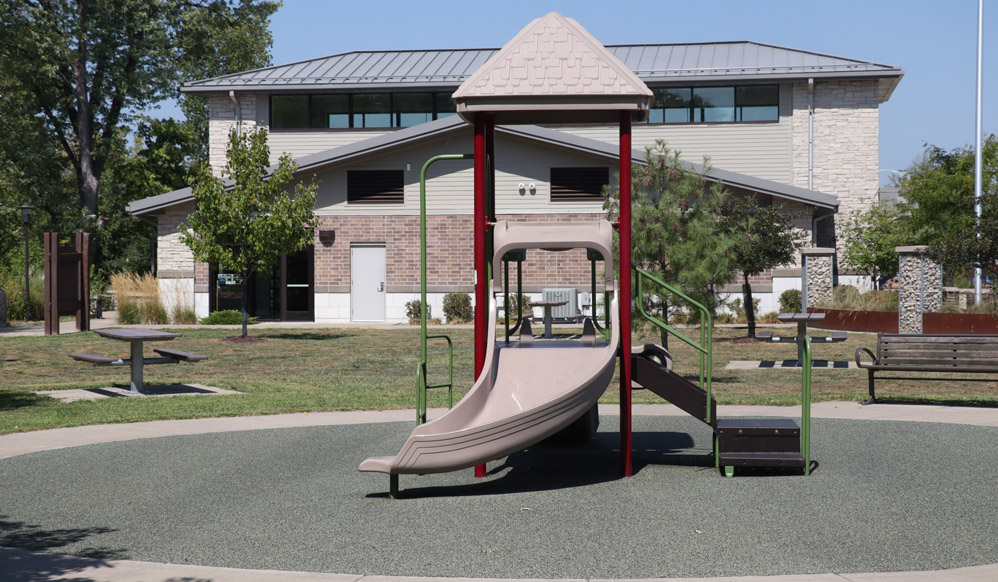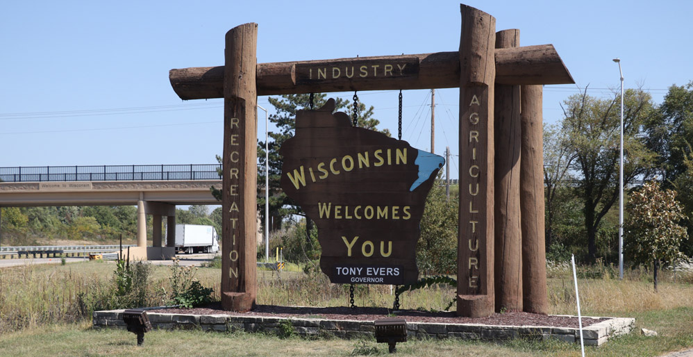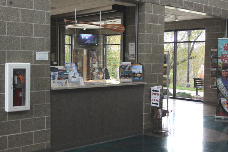 A nearby housing development can be seen just over the fence of the rest area. This would appear to make it an unlikely spot to need a rest area, but cities and suburban areas can be just as daunting for travelers seeking a break, as the open road. Additionally, this is a state border. Just across the river is the state of Minnesota. This rest stop doubles as a welcome center, providing tourist information This is a large rest area designed to showcase the state, welcome visitors, and provide tourist information. It has a staffed tourist information counter, as well as the traditional Welcome to Wisconsin sign, and a Welcome to Wisconsin metal sculpture. In addition to the usual picnic area, historical markers, pet area, and gardens, there is a children's play area, and a river walk.