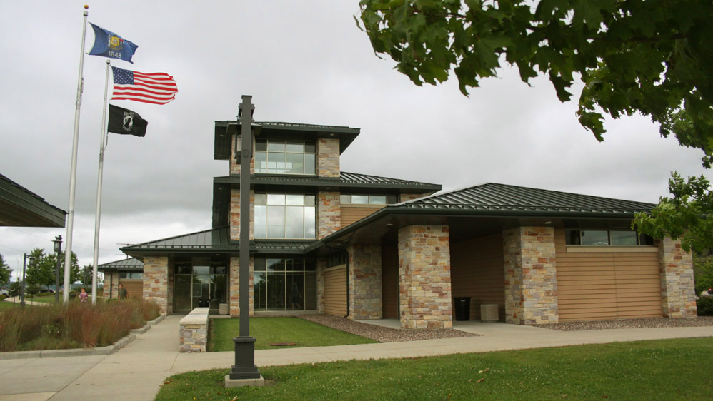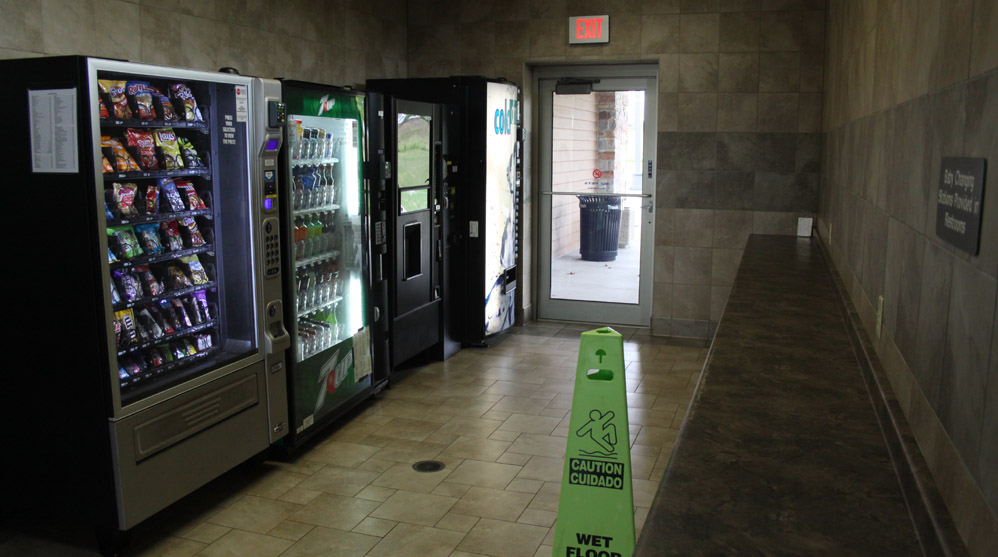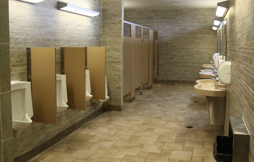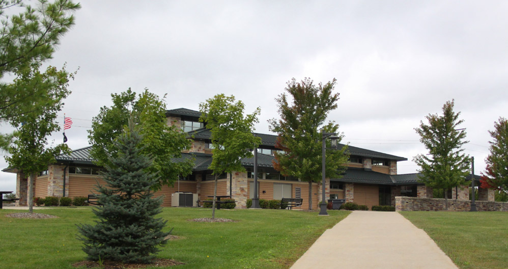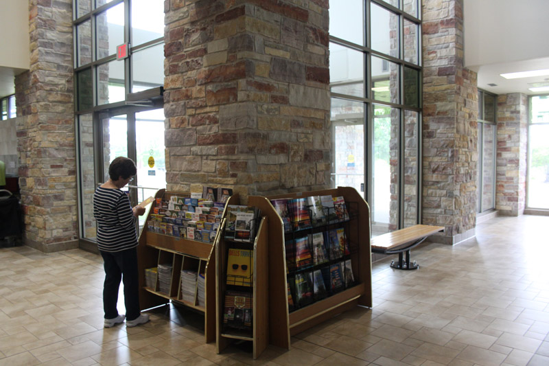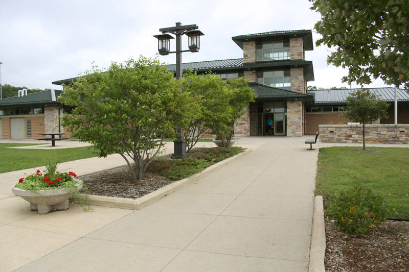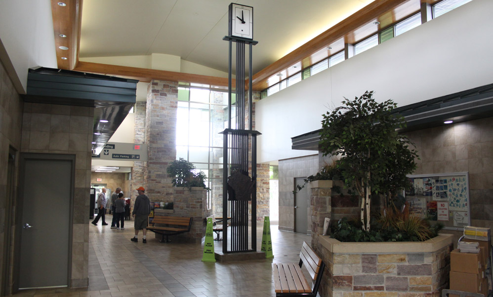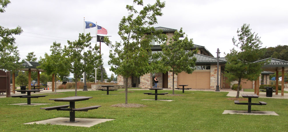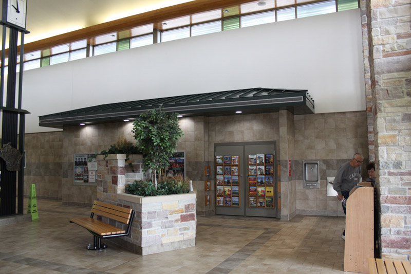 There are several public entrances, as well as a service entrance in the back. The main entrance is a well sheltered arcade, opening onto a vestibule with double glass doors. It is pleasantly shady in the summer, and helps quite a bit with the blustery winds and snow of the winter. I am always impressed with the massive construction of these places and the high build quality. The high ceilings and generous windows of the skylights, along with the glass of th The building is surrounded by walkways and has planters and even a couple of small lawns. A half wall separates the pavilion from the picnic, parking, and special use areas. It may also help to act as a partial windbreak. This massive structure, is overbuilt in the style of all government buildings, and cuts no corners. It will doubtless outlast those that built it. All entrances and areas are handicap accessible. All facings are made to require little maintenance. Stone and brick require no paining and do not rot. The metal roof will not leak or require shingling. The interior is similarly low maintenance. |