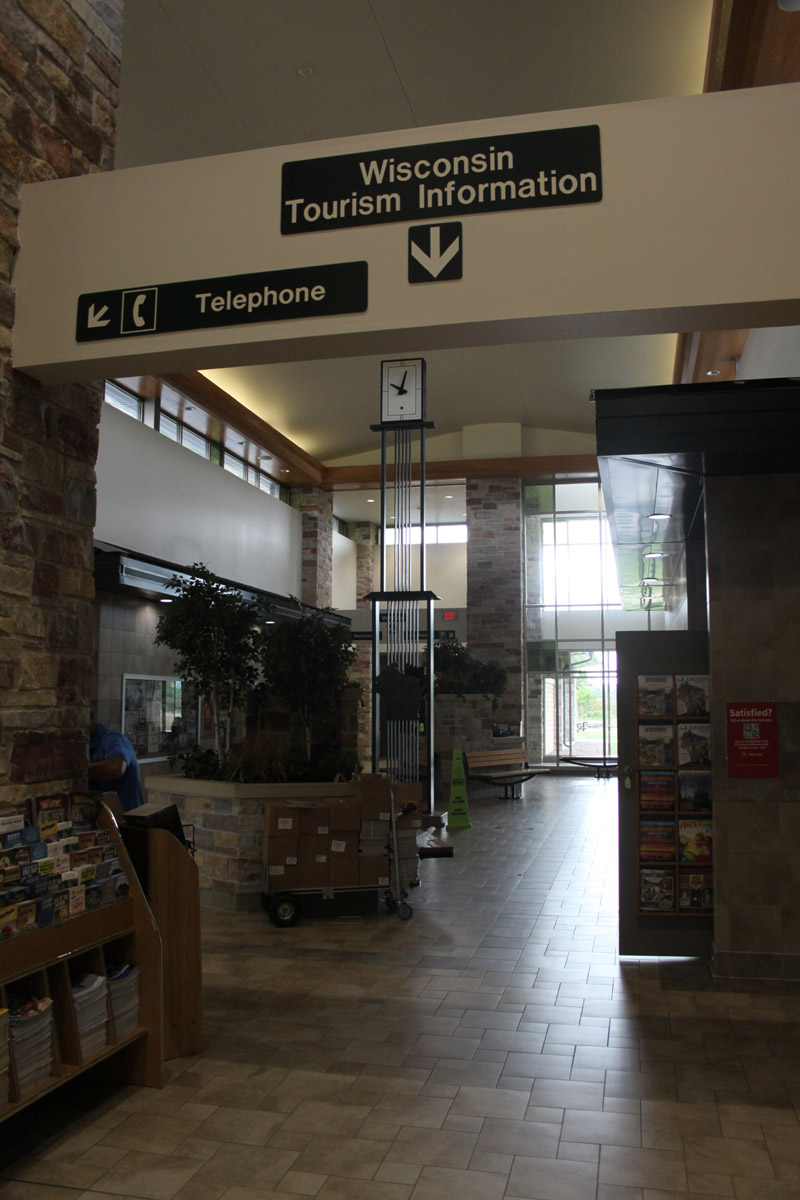 As one of the larger rest areas, this stop has one of the larger pavilions. It is also somewhat unique in that it features a large collection of tourist literature. As a general rule, only the welcome center rest areas on the state borders offer this; but there are a couple of reasons for this. The Poynette rest These stops are also very busy.Not only are they in close proximity to Madison, the state capital, they are also on three Interstate highways, I39, !94, and I90. This is the route taken to the Wisconsin Dells, one of the big attractions of the Midwest. In addition to racks and racks full of brochures, pamphlets, flyers, and guidebooks, this stop offers the expected vending machines, rest rooms, message boards, and weather information. In common with many other roadside stops, there are pay phones with TTy capability. Literature is replenished daily, and is stored in closets behind the display racks. In basic design, this pavilion has a very high ceiling with skylight openings. and a bit of a tower, to let in even more light. This is supported by stone columns. This is one of the more striking designs, with an interior of stone and brick, with lighter colored walls higher up, and a ceiling lined with windows. Inside, the centerpiece is a large clock that takes full advantage of the high ceiling of the interior.The clock features a hammered metal profile of the state of Wisconsin. The interior is light enough, and large enough, that there are planters and trees, as well as benches. The design is a basic rectangle with wings, allowing for vending machines, restrooms, phones, and some other building features to be out of the main flow of interior traffic. In common with all of the rest stop pavilions, this building is built to last. It is a steel frame structure with poured concrete and then faced with stone, tile, and brick. A maintenance and utility section sits in the middle of the building, restricted to employees. This building is kept spotlessly clean and well maintained by a state program that uses various non-profit groups. These are paid through taxes and somewhat subsidized by profits from the vending machines. Many of the workers are supported by the American Council for the Blind, though other organizations are also represented. Drinking fountains, and tap water fill ups are located in several areas near the literature displays, as well as in the restrooms. Though not an official welcome center, this stop is so busy, that it seems to be regularly staffed, in contrast to most of the rest areas which are only intermittently staffed during cleaning or maintenance operations. It also seems to be a popular hangout for state highway workers, and is a regular stop for the State Patrol. . While there are vending machines available, Wisconsin, unlike some states, keeps commercial services and public services completely separate. This means no fast food, groceries, gas stations, or other commercial ventures are allowed at rest stops. Wisconsin also separates services for the opposing lanes of traffic, so that easy access is only available for one direction of traffic. This generally means that such stops are set up in pairs, usually in close proximity to each other, with each serving a single direction of traffic. While I noticed no diaper changing stations in the men's room, there are special family and assisted rest rooms that have them. The entire facility is handicapped accessible, and sits on one level. |