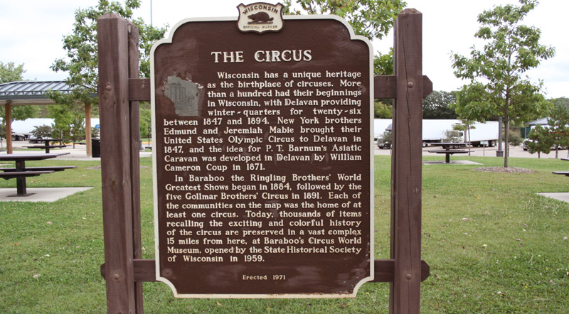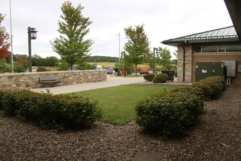 Most rest stops feature areas where there are natural plantings to showcase the look of the land before settlement and farming changed everything. The natural growth areas lend themselves to walking trails. In the case of the Poynette stop, this is off behind the pavilion,. This spot takes advantage of a natural growth of spruce on a nearby hillside, to place a sign indicating the contribution of the spruce to the local geography, and to give some details about its properties. Another sign indicates the contributions to the founding of the nation, by veterans of the revolutionary army, who ended up living in the area that is now the state of Wisconsin. Wisconsin did not exist as a territory until 1836, and did not become a state until 1848. So these men fought for a nation that did not yet exist, and then settled in a state that did not yet exist. Another marker honors Wisconsin members of the military, and recognizes that this freeway is the Wisconsin Veteran's Memorial Highway. Soldiers from Wisconsin, or the area that would someday become Wisconsin, fought in Every war the nation has ever fought, including the Revolutionary war. Also honored by a historical marker is Wisconsin's circus heritage. When circuses were in their prime, over a hundred of them started in Wisconsin, with many using the state as winter quarters during the seasons when travel was difficult. Most rest stops have pet walking areas. This gives pet owner an alternative to soiling the lawns or picnic areas. There are also some limited trails that could qualify as people walking areas, to let tired drivers stretch their legs a bit. While there is no camping, the picnic areas here are extensive. The Poynette picnic grounds were showcased in more detail above. Playgrounds are getting to be a more common feature at these rest stops. As these are rest stops and not public parks, the playgrounds are not particularly elaborate, but they are a welcome break for kids cooped up in a car for hours at a time. The little play area at Poynette consists of a padded ring within which is housed a kind of a climbing gym with slides. Outside of the padded area is a circle of concrete,and benches for watching parents. This will not be too thrilling to older children, who should be off on the walking trails in stead, but will be a treat for younger ones. |