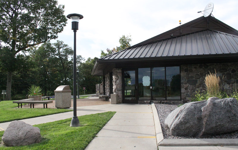 Government buildings, particularly those meant for public use, are built like bunkers. The pavilion for this rest site, as for most others, is a literal rendition of the classic brick outhouse. This is a steel frame concrete building with a stone face and a metal roof. It will last for hundreds of years, unless it is demolished to make room for something else. These stops are designed for 24 x 7 access, and for remote locations that may mean irregular maintenance, or long intervals between maintenance. Though regularly patrolled, and watched by sheriffs and other law enforcement, they also must deal with the possibility of vandalism, and attempts at theft of equipment. This particular stop is near enough to a small town to have access to city water and power. A satellite dish on the roof serves to provide up to the minute weather information on a monitor inside. It also connects the various alarm and system monitors to a central monitoring station. A system malfunction, or a security breach of the private portions of the building will elicit a response. The pavilion and its matching shed are six sided structures. The shed houses lawn care equipment, and other gear that would not fit in the pavilion, or may be unsuitable for indoor storage. As in the case of its sister site at Lomira, this pavilion was built in 1989 to replace the more primitive structure The pavilion features a pair of large bay style windows, in an attempt to let in some light, and relieve the sometimes gloomy and oppressive feel of these bunker style buildings. These windows look out upon a hard surfaced deck, and ultimately out onto the freeway. The anodized metal root is of aluminum, but is finished to look like copper. It is surrounded by well lit walkways, plantings of native vegetation, and several recycle stations. A satellite dish can be seen on the roof, providing communications for weather and alarms systems. As of this writing, there is no wifi, but it is only a matter of time. |