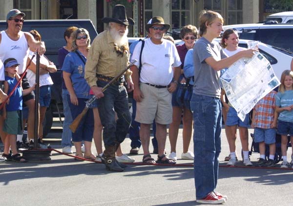 A little boy is temporarily a deputy to the shotgun toting sheriff. |
