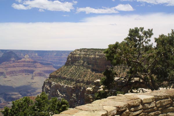 A partially shaded rest area welcomes visitors along one of the rim