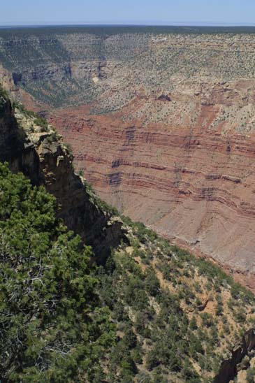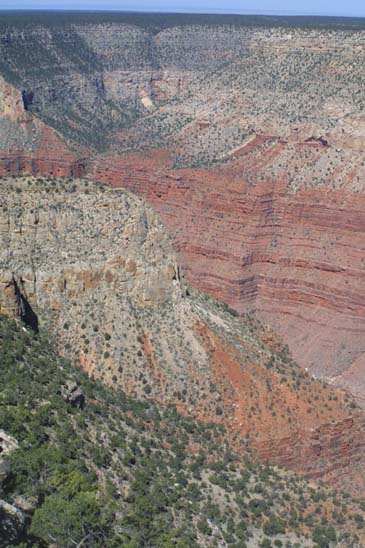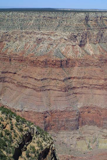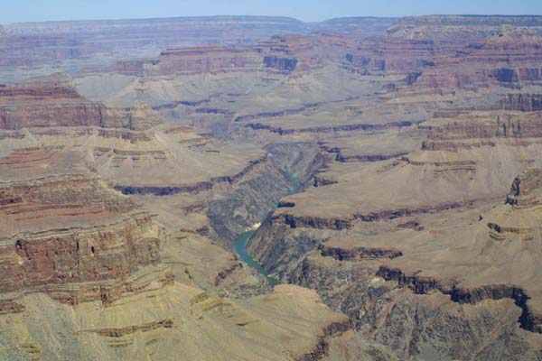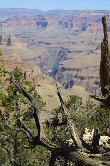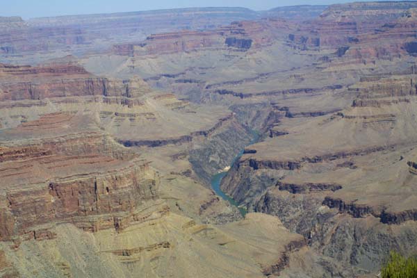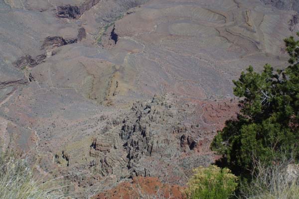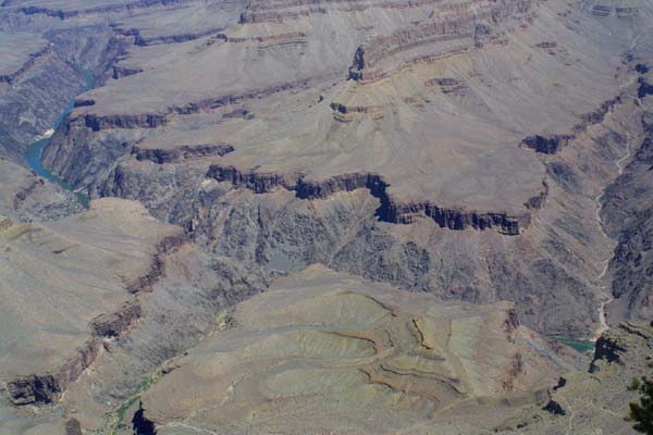 A flash of green tells of the appearance of the Colorado. This is the little ribbon of water that sculpted this whole canyon. Like a modest craftsman, it rarely shows itself, but lets it's work do the talking.