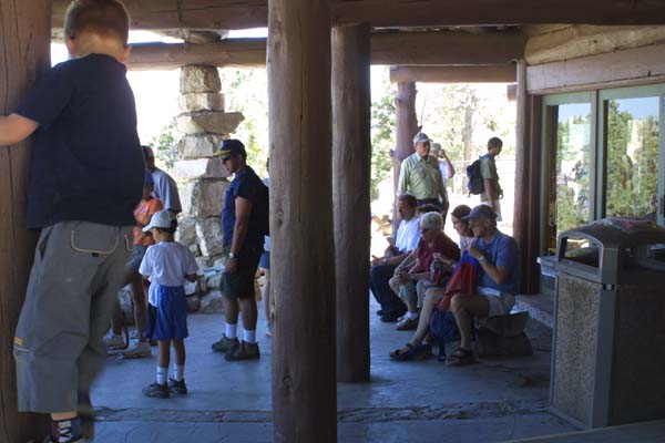 The shady porch at Hermit's Rest. This is a comfortable place to sit a while, and look out onto the canyon. Snacks, drinks, and a small shop are inside, along with spacious lounging areas.