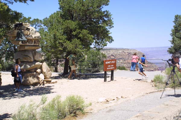 Cameras are everywhere. A portrait is being taken under the bell of the main entrance to Hermit's Rest.