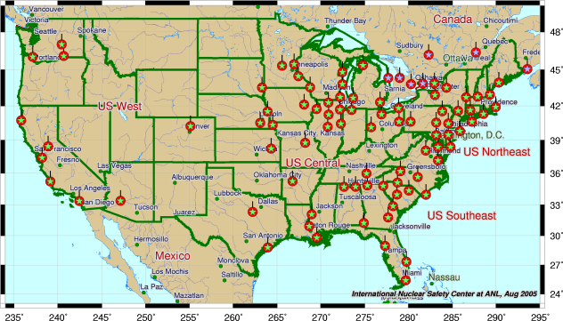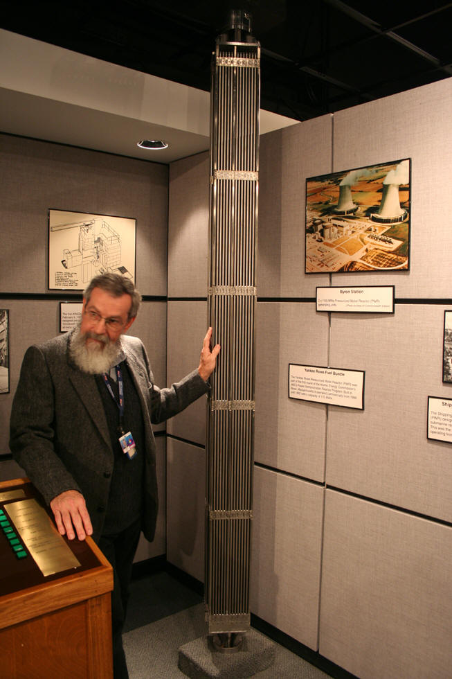 The basic slow reactor uses enriched uranium, to about 3% U235 as fuel. This is converted to the oxide, which is a ceramic. The oxide is in the form of pellets, which fill metal tubes, bound together in an assembly, which is combined with other assemblies to make the reactor core. A photo of an assembly is shown below, taken at Argonne National Laboratory. These cores are replenished about every six years, with a third of the core being replaced every two years. This is done using a single convoy of trucks, as opposed to the constant stream of coal trains required for replenishment of a regular coal fired power plant.