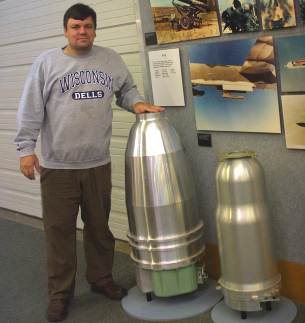 standing next to a pair of casings for modern nuclear
