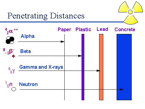 The decay of an atomic nucleus produces a number of different particles which together are lumped under the designation of radiation. Radiation is measured in various ways, by detecting it's energy; but not all radiation is created equal. There are essentially four types of radiation given off, during the nuclear process. There is alpha, beta, and gamma radiation, as well as Neutrons, X-rays, heat, and considerable amounts of ordinary light. Alpha particles are the heaviest, and least dangerous form of radiation, as far as exposure hazards are concerned. An alpha particle is essentially a helium nucleus, consisting of a pair of neutrons, and a pair of protons. It carries a positive charge, and wants desperately to pick up a pair of electrons and make itself whole. A few feet of air, will prevent penetration by alpha particles. Even so, because of their heavy mass, and double positive charge, Alpha particles actually have the highest potential for causing damage, should they be able to enter the body. Generally, Alpha particles are dangerous, only if a subject should ingest a radioactive substance which gives them off. Another positively charged particle given off, though rarely, is the proton. A proton can be thought of as a hydrogen nucleus. Like the alpha particle, the goal of the proton is to pick up an electron, in order to make itself a whole and neutral atom. Like the alpha particle, the proton rarely gets more than a few inches from it's source, before being neutralized by the surrounding air. Another charged particle given off, is the beta particle, essentially a high speed electron, or less commonly a high speed positron. Having a charge, the beta particle is seeking an opposite charge with which to make itself whole. Beta particles are stopped by ten feet or so of air, a thin sheet of metal or plastic, or by your skin. The more dangerous forms or radiation, over distance, are those whose particles carry no charge. These are much more resistant to being neutralized, and can carry substantial amounts of energy. X-rays, and gamma rays are both forms of high energy photons, making them essentially high energy, and high frequency forms of light. Concrete, and even lead is required to stop high energy photons. These are both forms of ionizing radiation; in essence, they burn us. Though they work at the atomic level rather than the chemical level, they have the same effect on our bodies as the hydroxide (OH), which is the ultimate source of free radical chemicals in the body. X-rays have more energy than ultra violet light; but generally not as much as gamma rays. As a general rule, gamma rays have more energy and a higher frequency than X-rays; but there is some overlap. While X-rays, and gamma rays of the same frequency are essentially the same, they are differentiated by their source. X-rays come from electrons which wiggle or bounce, while gamma rays come from a nucleus whose particles are made to wiggle or bounce. This would seem to imply that the nucleus, far from being a static collection of particles, has some internal motion; but that is a subject for another time. It is very rare for electrons to produce X-rays with so much energy that they rise into the gamma ray range, and equally rare for a nucleus to produce gamma rays at such low energy that they drop into the range of X-rays; but it does sometimes happen. Photons are pure energy, and have no mass, as well as no charge. Probably the most