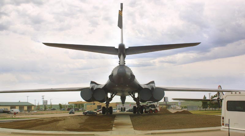 | Above: The above photo shows our newest Nuclear bomber, the B-1, with our oldest nuclear bomber, the B-29 in the background. Left:: The tail end of the B-1. These aircraft can carry huge bomb loads, very long distances, and have a very small radar signature. The original design was supersonic, and very high flying. Today's new B-1 flys very low, and just a bit under mach -1. This is in recognition of today's more effect anti aircraft armament. Below: The B-1, and the Minuteman |