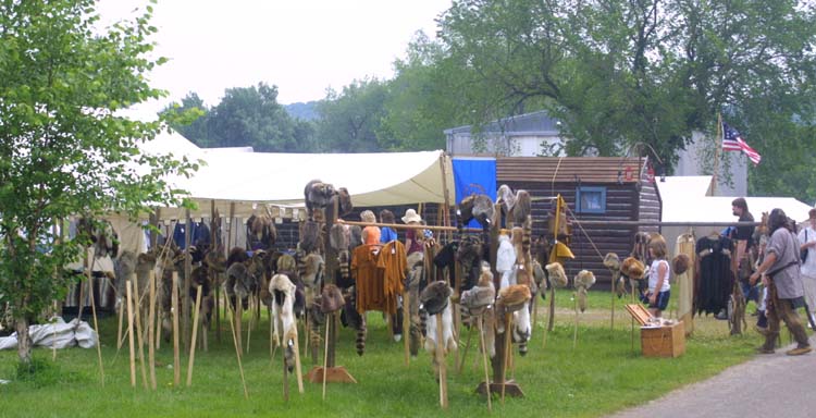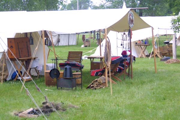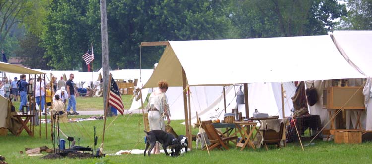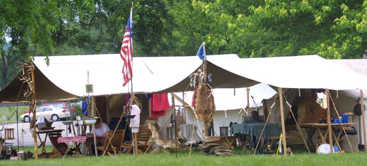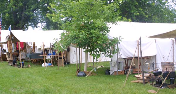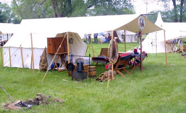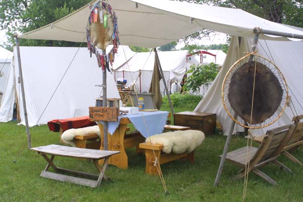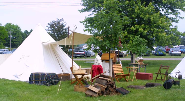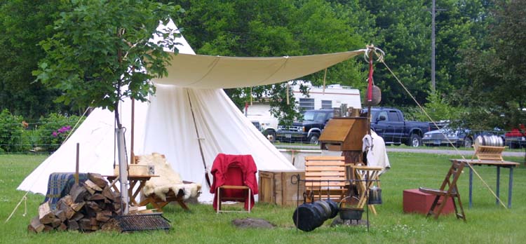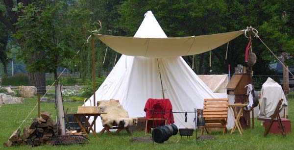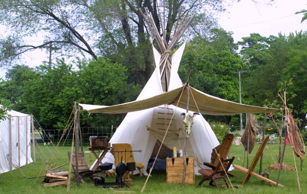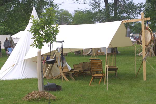 | Assorted styles of living quarters reflect different interests among those attending the rendezvous. Teepees of differing sizes and sophistication levels abound, as in this example at left. There are also large numbers of campaign tent inspired dwellings as in the example shown above and below. These were inspired by the campaign tents used by armies in the field. many trappers had at one time served as army scouts or had been in the army. | |