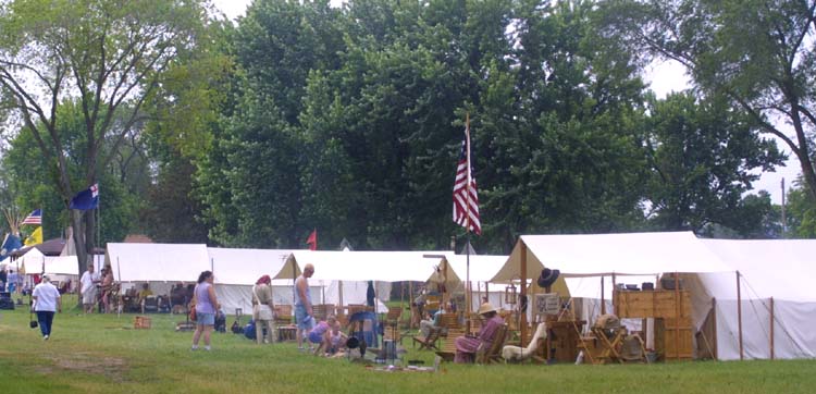| A comfortable but less elaborate camp. All of these tents are made of cotton canvas. This is the same material, though of a different color, as what blue jeans are made from. | |