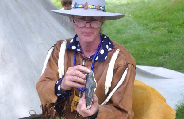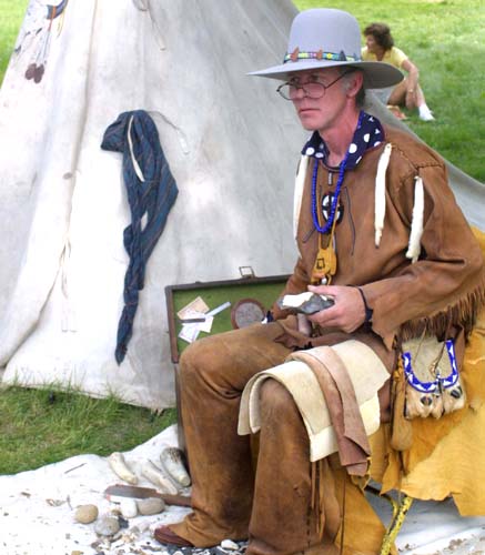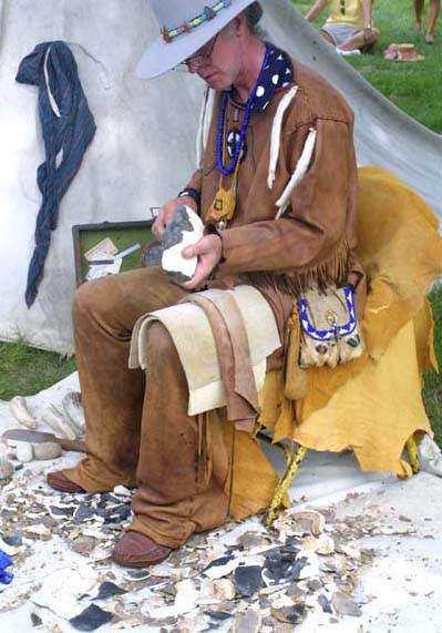 | Relearning an old art, this man makes arrow heads from pieces of flint, much as the Indians of hundreds of years ago produced them. At his feet lie the remains of some failed efforts, and practice strokes. | |
