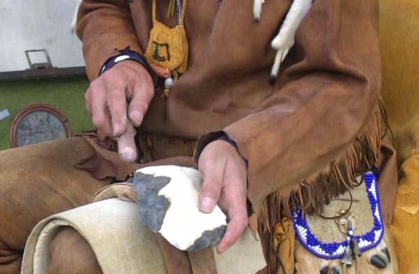| Showing how it is done. The pieces are knocked off fracturing the flint with a mandrel. Several mandrels of different hardness and weight are used. | |