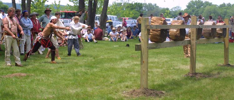 Pulling the knives out of the tree sections used as targets,