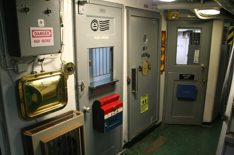 Main street. This hallway led to the mess areas, and featured the post office, personnel office, and the door leading down to the fire room. The red and orange molding on the wall to the right of the fire room door, is the emergency shut down for the fire room. Should the fire room be blocked off, or uninhabitable during a battle, this can be used to shut down the engines, and prevent a possible explosion.