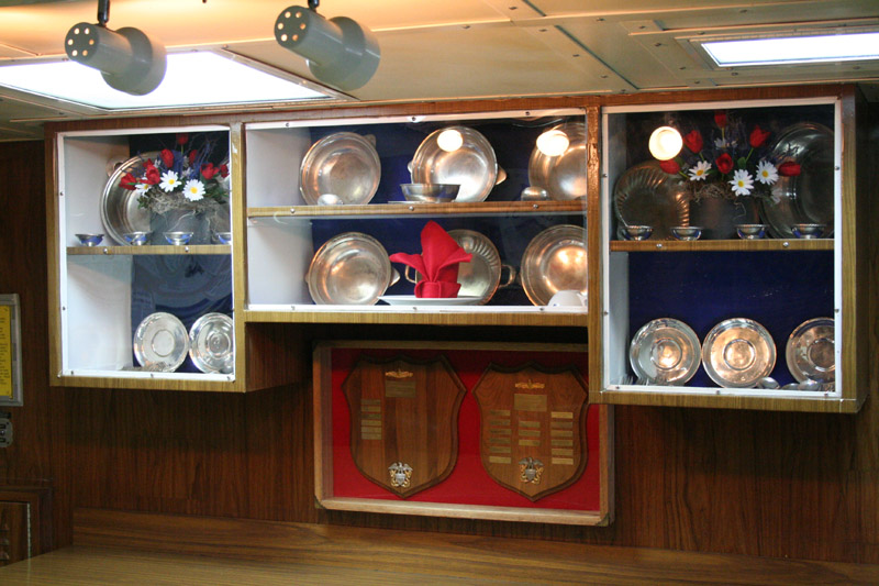 The ships silver and dining cutlery, are displayed here, This might also be a sort of a trophy display for any awards or prizes.